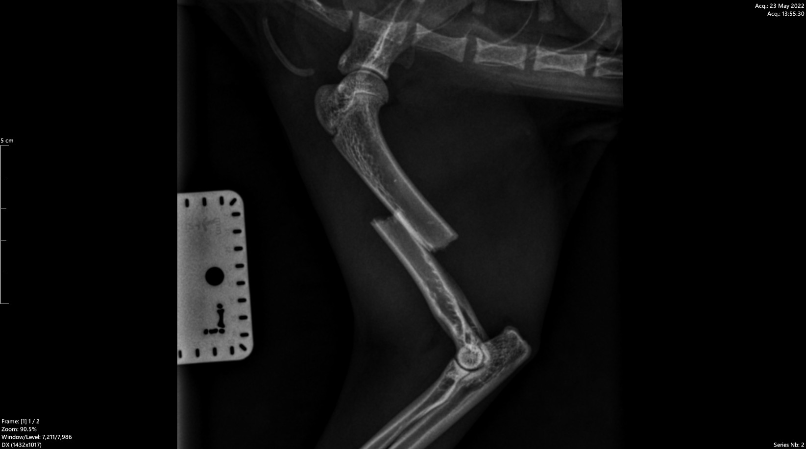 We are able to undertake the majority of fracture repairs following x-rays at your normal vets. We use a range of plate, pins, screws and external skeletal fixators to get your pet back to full function as soon as possible.